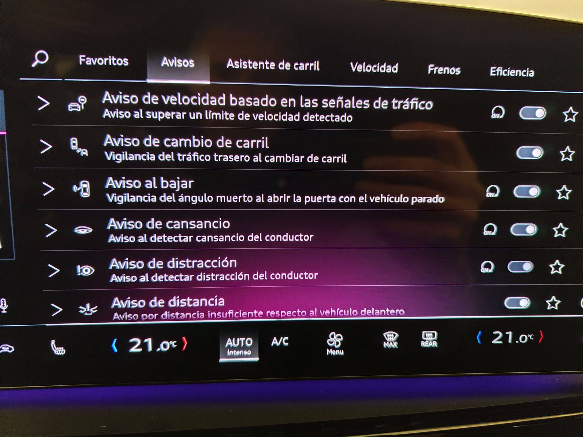 - Regulación de los faros con ajuste de altura automático, faros direccionales, sensor de oscuridad, sensor de vehículos en sentido contrario y función de faros antiniebla