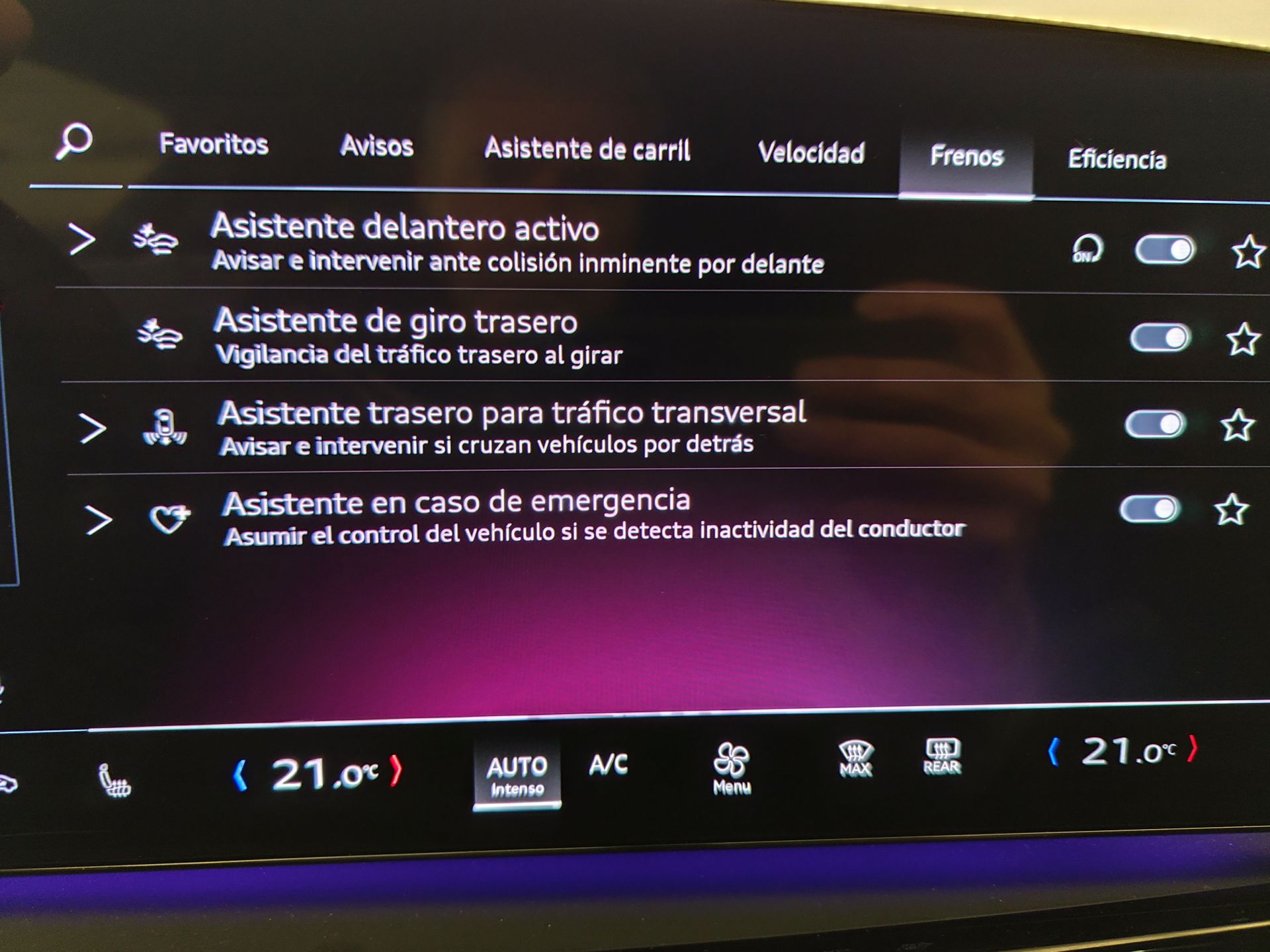 - Sistema de alarma de colisión: activa las luces de freno con asistencia de frenado, sistema antiatropello peatones/ciclistas, monitorización del conductor y frenado a baja velocidad aviso visual/ acústico, incluye tráfico cruzado en cruce, incluye tráfico frontal en cruce y prevención de objetos