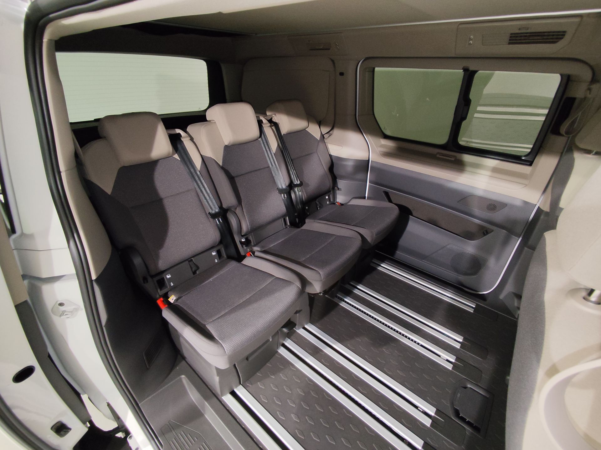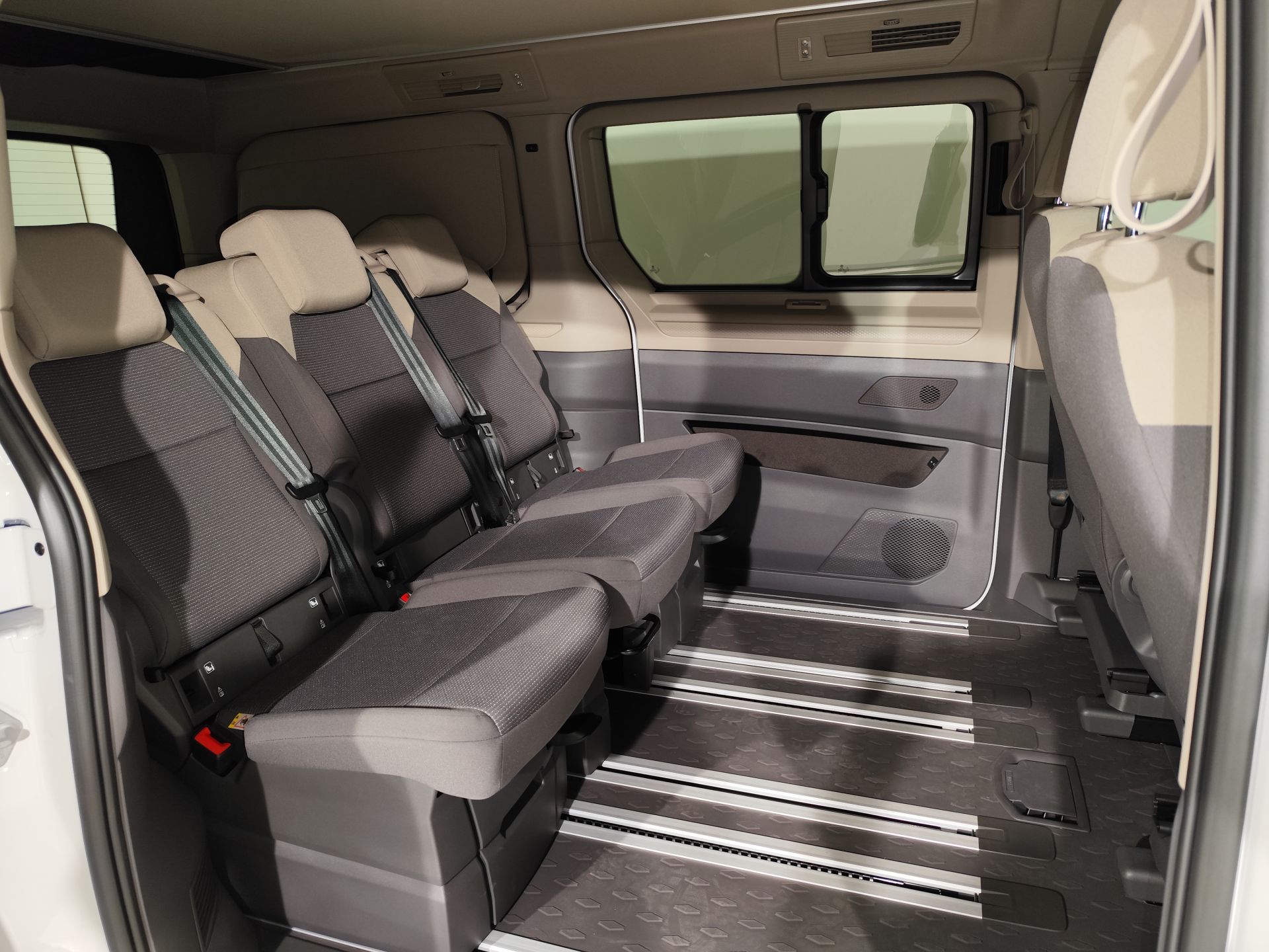 - Asientos traseros de tres plazas de tipo individual desmontables de orientación delantera ajuste longitudinal manual con banqueta fija, respaldo abatible individual y ajuste manual del respaldo función cama